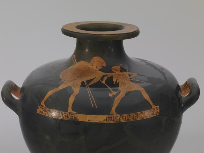 | Keywords: Berlin Painter - Red-figure Hydria with Theseus (?) and an Amazon - Walters 4879 - Detail B.jpg Two figures stand on a ground-line of meander on the shoulder of this hydria At left a young Greek soldier advances to the right his legs and head in profile with his torso turned to present his back to the viewer He wears a chitoniskos chlamys greaves and an Attic helmet its cheek pieces raised to expose his face His left arm obscured by his body holds a shield and two spears He extends his right hand toward the Amazon before him and their gazes meet The Amazon attempts to flee from the soldier her legs are in profile moving right while her torso is depicted frontally and her head turns back to look at her pursuer Like the soldier she is clad in a chitoniskos though hers has a loose kolpos in front and she wears a short mantle a disk earring and a pointed cap from which small curls emerge around the forehead Her weaponry includes a bow in her left hand and a sagaris or small axe ineffectually pointing downward in her right hand Several mythological heroes were said to have had encounters with the Amazons but the identity of the figure represented here remains uncertain The meeting of the figures' gazes is evocative of the story of Achilles and the Amazon Penthesilea who were said to have fallen in love just as the warrior-hero plunged his sword into her chest The scene might also depict Theseus the Athenian hero who fought the Amazon queen Antiope ca 500 490 BC early Classical terracotta H 16 1/4 x W with handles 16 7/8 x Diam 14 7/16 in 41 3 x 42 8 x 36 6 cm accession number 48 79 36031 Don Marcello Massarenti Collection Rome prior to 1897 cat no 186 Henry Walters city Baltimore Walters Art Museum Henry Walters Acquired by Henry Walters with the Massarenti Collection 1902 Heroes Mortals and Myths in Ancient Greece The Walters Art Museum Baltimore; Frist Center for the Visual Arts Nashville; San Diego Museum Of Art San Diego; Alexander S Onassis Public Benefit Foundation USA New York 2009-2011 place of origin Attica Greece Walters Art Museum license Ancient Greek red-figure pottery in the Walters Art Museum Berlin Painter Media contributed by the Walters Art Museum needs category review Amazons in ancient Greek pottery Berlin Painter - Red-figure Hydria with Theseus (?) and an Amazon - Walters 4879 - Detail B.jpg Two figures stand on a ground-line of meander on the shoulder of this hydria At left a young Greek soldier advances to the right his legs and head in profile with his torso turned to present his back to the viewer He wears a chitoniskos chlamys greaves and an Attic helmet its cheek pieces raised to expose his face His left arm obscured by his body holds a shield and two spears He extends his right hand toward the Amazon before him and their gazes meet The Amazon attempts to flee from the soldier her legs are in profile moving right while her torso is depicted frontally and her head turns back to look at her pursuer Like the soldier she is clad in a chitoniskos though hers has a loose kolpos in front and she wears a short mantle a disk earring and a pointed cap from which small curls emerge around the forehead Her weaponry includes a bow in her left hand and a sagaris or small axe ineffectually pointing downward in her right hand Several mythological heroes were said to have had encounters with the Amazons but the identity of the figure represented here remains uncertain The meeting of the figures' gazes is evocative of the story of Achilles and the Amazon Penthesilea who were said to have fallen in love just as the warrior-hero plunged his sword into her chest The scene might also depict Theseus the Athenian hero who fought the Amazon queen Antiope ca 500 490 BC early Classical terracotta H 16 1/4 x W with handles 16 7/8 x Diam 14 7/16 in 41 3 x 42 8 x 36 6 cm accession number 48 79 36031 Don Marcello Massarenti Collection Rome prior to 1897 cat no 186 Henry Walters city Baltimore Walters Art Museum Henry Walters Acquired by Henry Walters with the Massarenti Collection 1902 Heroes Mortals and Myths in Ancient Greece The Walters Art Museum Baltimore; Frist Center for the Visual Arts Nashville; San Diego Museum Of Art San Diego; Alexander S Onassis Public Benefit Foundation USA New York 2009-2011 place of origin Attica Greece Walters Art Museum license Ancient Greek red-figure pottery in the Walters Art Museum Berlin Painter Media contributed by the Walters Art Museum needs category review Amazons in ancient Greek pottery |