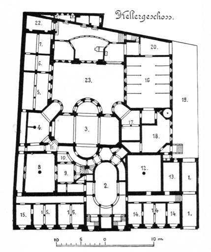 Keywords: Berlin Palais Strousberg Grundriss Kellergeschoss.jpg Berlin - plan basement of palais Strousberg at Wilhelmstraße 70 <small> 1 Passage 2 Servants dinning room 3 Kitchen 4 utility room 5 Laundry room with washing machine 6 Ironing room 7 Mangle room 8 Larder 9 Lightwell 10 Washroom 11 Elevator 12 Boiler room 13 Wine cellar 14 Coachmans accomodation 15 Servants room 16 Stable 17 Crockery room 18 Larder 19 Covered courtyard Coachhouse 20 Passage 22 Grotto 23 Courtyard </small> Berlin - Grundriss Kellergeschoss Palais Strousberg an der Wilhelmstraße 70<br> <small>Grundriss Kellergeschoss </small><br> <small>1 Durchfahrt 2 Speisezimmer der Dienerschaft 3 Küche 4 Wirtschaftsraum 5 Waschküche mit Waschmaschine 6 Plättstube 7 Rollkammer 8 Speisekammer 9 Lichthof 10 Spülraum 11 Aufzug 12 Warmwasserheizung 13 Weinkeller 14 Kutscherwohnung 15 Dienerzimmer 16 Pferdestall 17 Geschirrkammer 18 Futterkammer 19 Ã berdeckter Hof Wagenremise 20 Durchgang 22 Grotte 23 Hof </small> Berlin und seine Bauten Verlag Wilhelm Ernst Sohn 1896 1896 August Orth PD-old Palais Strousberg Floor plans