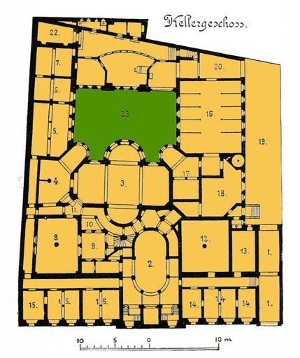 | Keywords: Berlin Palais Strousberg Grundriss Kellergeschoss coloured.jpg  Berlin - plan basement of palais Strousberg at Wilhelmstraße 70 <small> 1 Passage 2 Servants dinning room 3 Kitchen 4 Accounts room 5 Laundry room with washing machine 6 Ironing room 7 Mangel room 8 Larder 9 Lightwell 10 Washroom 11 Elevator 12 Hot water heating 13 Wine cellar 14 Coachmans accomodation 15 Servants room 16 Stable 17 Tack room 18 Fodder room 19 Covered courtyard Coachhouse 20 Passage 22 Grotto 23 Courtyard </small> Berlin - Grundriss Kellergeschoss Palais Strousberg an der Wilhelmstraße 70<br> <small>Grundriss Kellergeschoss </small><br> <small>1 Durchfahrt 2 Speisezimmer der Dienerschaft 3 Küche 4 Wirtschaftsraum 5 Waschküche mit Waschmaschine 6 Plättstube 7 Rollkammer 8 Speisekammer 9 Lichthof 10 Spülraum 11 Aufzug 12 Warmwasserheizung 13 Weinkeller 14 Kutscherwohnung 15 Dienerzimmer 16 Pferdestall 17 Geschirrkammer 18 Futterkammer 19 Ã berdeckter Hof Wagenremise 20 Durchgang 22 Grotte 23 Hof </small> Berlin und seine Bauten Verlag Wilhelm Ernst Sohn 1896 1896 August Orth PD-old GFDL Cc-by-sa-3 0-migrated Palais Strousberg Floor plans |