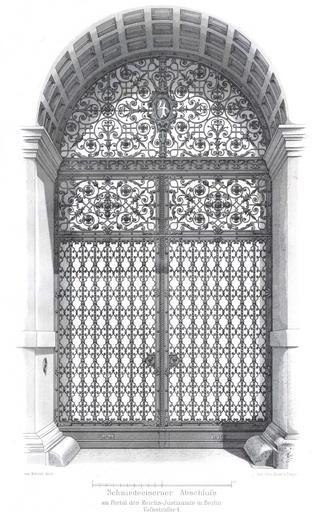 Keywords: Berlin Reichsjustizamt Vossstrasse 4 AS.jpg en Berlin -Wrought iron gate of the Reichsjustizamt Voßstraße 5 de Berlin - schmiedeisernes Tor am Portal des Reichsjustizamtes Voßstraße 5 Architektonisches Skizzenbuch Heft 1 1885 Blatt 6 1885 Mörner PD-old Reichsjustizamt building Wrought iron gates in Berlin Mörner family |