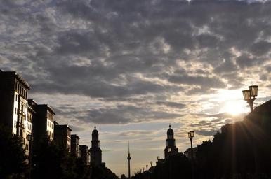 Keywords: berlin tv tower frankfurter tor sunset stalin buildings sky clouds architecture
