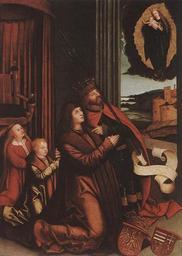 Keywords: Bernhard Strigel - St Ladislas Presents Wladislav II and his Sons to the Virgin - WGA21888.jpg Artwork Creator Bernhard Strigel between 1511 1512 Wood size cm 43 30 8 Institution Budapest Museum of Fine Arts object history credit line accession number WGA link 21888 http //www wga hu/art/s/strigel/bernhard/wladisla jpg http //www wga hu/html/s/strigel/bernhard/wladisla html PD-old-100 painting religious German 1501-1550 Bernhard Strigel St Ladislas Presents Wladislav II and his Sons to the Virgin German paintings in the Museum of Fine Arts Budapest 1510s paintings from Germany WGA form painting WGA type religious WGA School German WGA time period 1501-1550 1510s paintings in Hungary Kneeling in art Male fur clothing in art Paintings by Bernhard Strigel with fur Paintings lacking painting technique information 16th-century religious paintings in Hungary Fur fashion in 1511 |