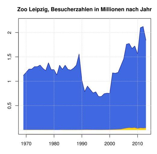 Keywords: Besucher.svg de Besucherzahlen des Zoo Leipzig Blau Gesamtbesucherzahlen Orange Besucher mit Jahreskarte 2011-06-30 own Accountalive Erzeugt durch folgendes R-Skript <pre>zoo <- matrix c 1969 1119000 1560 1971 1250000 1623 1972 1250000 1624 1973 1300000 1810 1974 1300000 1700 1975 1332194 1654 1976 1264726 1948 1977 1218617 1407 1978 1380000 1700 1979 1238000 1324 1980 1240000 1388 1981 1130000 NA 1982 1330000 1367 1983 1246500 1316 1984 1330000 1183 1985 1243000 1007 1986 1230000 998 1987 1268000 944 1988 1330000 924 1989 1560000 1075 1990 1021293 1580 1991 789272 3254 1992 901496 3790 1993 831426 2270 1994 761563 1979 1995 782951 1954 1996 686731 1501 1997 687398 1382 1998 744749 2147 1999 755736 2829 2000 751619 4227 2001 1172158 6392 2002 1164392 8546 2003 1181535 11122 2004 1319767 14000 2005 1457938 25616 2006 1759963 35554 2007 1774587 42854 2008 1673608 39515 2009 1723349 45209 2010 1560791 27553 2011 2098075 38732 2012 2123349 34701 2013 1842000 39024 ncol 3 byrow TRUE jahr zoo 1 besucher zoo 2 dauerticket zoo 3 par mar c 3 2 3 3 1 fontscale 0 7 Leerer Plot zwecks Einstellungen alle am selben Ort etc plot jahr besucher ylim c 0 2200000 type l col NA xlab ylab main Zoo Leipzig Besucherzahlen in Millionen nach Jahr yaxt n cex main 8 cex axis fontscale y<-c 0 5 1 1 5 2 1e6 axis 2 at y labels formatC y/1e6 big mark format fg decimal mark cex axis fontscale Als Flaechen polyX c jahr max jahr min jahr polyBesucher c besucher 0 0 polygon polyX polyBesucher col royalblue border NA Ohne Fehlende Werte zooDauer matrix zoo is na zoo 3 ncol 3 jahrDauer zooDauer 1 dauerticket zooDauer 3 polyXDauer c jahrDauer max jahrDauer min jahrDauer polyDauerticket c dauerticket 0 0 polygon polyXDauer polyDauerticket col gold border NA lines jahr besucher type l col navy lines jahr zoo 3 type l col orange grid </pre> cc-zero Uploaded with UploadWizard Leipzig Zoo
