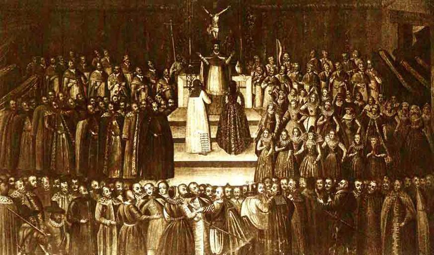 Keywords: Bethrotal of Marina Mniszech.jpeg Per procura nuptials of False Dmitri and Marina Mniszech in Kraków on November 12 1605 Ślub per procura Dymitra Samozwańca i Maryny Mniszchówny w Krakowie 12 listopada 1605 Заочное об учение а ины нишек с Лжедмит ием I в К акове 12 нояб я 1605 Creator Szymon Boguszowicz ca 1613 oil canvas State Historical Museum Moscow Plafond ceiling painting from a coffered Venetian ceiling executed to adorn the so-called Family Room Sala Familii in the Laszki Murowane Castle The cycle originally consisted of 10 plafond paintings and 2 freize paintings on opposite walls depicting the story of Marina Mniszech Object history < 1613 commission Jerzy Mniszech and Jadwiga Tarło century 18 transfer Wiśniowiec Palace http //katolikforum ru/index php showtopic 110 st 0 p 1141 katolikforum ru PD-Art PD-old-100 Bethrotal of Marina Mniszech Files uploaded by Shakko from various sources