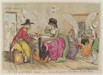 Keywords: Betty Canning revived - - or - a peep at the conjuration of Mary Squires, & the gypsey family by Samuel William Fores.jpg is for the initial mass upload and they will be updated to be image-specific in a second pass by a bot According to the NPG's website the work was published prior to 1859 and so the author is reasonably presumed dead by 1939 stocks Affidavit of Eliz Cannin left figure seated left at table For Gen<sup>l</sup> Gunning in pocket sealing a letter <poem>Well done Bett we'll get thro' the Business I'll warrant you; we can write all sorts of hands we've got all kinds of Seals with the aſsistance of our old Friend under the Table we shall be able to gull them yet daughter but I must be Mum </poem> letter on table To D_ of M_ Devil figure under table supplying fire for sealing and left arm up young woman's dress Swear young woman seated at table right covering mouth with papers <poem>I Swear that I never wish'd or tried directly or indirectly to get a Coronet; that I never saw or writ to Lord B_ or Lord L_ in all my Life; - that Men are my aversion; that I never had anything to do with with the Groom in all my born days will that do Dad </poem> woman seated to right using bellows Letter to the D of A on fire below pot of melting Coronets <poem>That's right my sweet innocent Angel say Grace boldly make haste my dear little lovely Lambkin I'll soon blow up the Fire while Nawntee Peg helps to cook up the Coronets; we'll get you a nice tit bit for Dinner before we've done my dear little deary </poem> woman standing to right of fire ladling the Coronets <poem>Puff away Sister the Soup will soon boil - law's me how soft the Green Peas do grow how they Jump about in the pot when you Puff your Bellows </poem> page on wall at right <poem>Waltham Abbey by Peg Niffy </poem> caption below picture Betty Canning revived _or_ A peep at the Conjuration of Mary Squires the Gypsey Family D13003 1791-03-25; or 1792<ref>http //www leejacksonmaps com/Caricatures htm</ref> Creator James Gillray PD-old-100 Notes http //members fortunecity com/chtii/irish/coot/gunning htm Gunning family - scandal details <references /> 1790s cartoons Brooms in art Crowns in art Paintings of the Devil Elizabeth Canning James Gillray Gunning caricatures National Portrait Gallery London Soup in art ImageNote 1 608 300 113 113 2400 1737 2 en <poem>Well done Bett we'll get thro' the Business I'll warrant you; we can write all sorts of hands we've got all kinds of Seals with the aſsistance of our old Friend under the Table we shall be able to gull them yet daughter but I must be Mum </poem> ImageNoteEnd 1 ImageNote 2 1073 1054 45 94 2400 1737 2 en Swear ImageNoteEnd 2 ImageNote 3 945 364 98 139 2400 1737 2 en <poem>I Swear that I never wish'd or tried directly or indirectly to get a Coronet; that I never saw or writ to Lord B_ or Lord L_ in all my Life; - that Men are my aversion; that I never had anything to do with with the Groom in all my born days will that do Dad </poem> ImageNoteEnd 3 ImageNote 4 225 473 38 86 2400 1737 2 en I'm ready to ride or swear or anything ImageNoteEnd 4 ImageNote 5 1714 563 86 128 2400 1737 2 en <poem>That's right my sweet innocent Angel say Grace boldly make haste my dear little lovely Lambkin I'll soon blow up the Fire while Nawntee Peg helps to cook up the Coronets; we'll get you a nice tit bit for Dinner before we've done my dear little deary </poem> ImageNoteEnd 5 ImageNote 6 2010 491 79 94 2400 1737 2 en <poem>Puff away Sister the Soup will soon boil - law's me how soft the Green Peas do grow how they Jump about in the pot when you Puff your Bellows </poem> ImageNoteEnd 6 ImageNote 7 1099 206 75 79 2400 1737 2 en Affidavit of Eliz Cannin ImageNoteEnd 7 ImageNote 8 1189 150 109 169 2400 1737 2 Stocks ImageNoteEnd 8