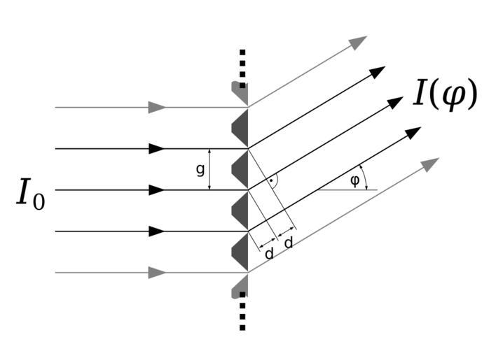 | Keywords: Beugungsgitter.svg de de Beugung Physik Beugung am optischen Transmissionsgitter Wenn der Gangunterschied d zwischen zwei benachbarten Einzelspalten ein Vielfaches der Wellenlänge beträgt ergibt sich in dieser Richtung ein Intensitätsmaximum g Gitterkonstante <math>d_ max g \cdot sin \varphi n \cdot \lambda n \in \Z</math><br /> en en Diffraction Transmission grid diffraction If the path difference d between two neighbouring single slits amounts to a multiple of the wavelength this direction will lead to an intensity maximum g grid constant <math>d_ max g \cdot sin \varphi n \cdot \lambda n \in \Z</math> Own Biezl Grating condition svg Inkscape Transmission gratings |