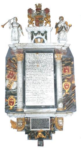 Keywords: BevilGrenvilleMonument 1714 KilkhamptonChurch.JPG Mural monument to Sir Bevil Grenville 1596-1643 south wall of Granville Chapel in Church of St James the Great Kilkhampton Cornwall Erected in 1714 by his grandson George Granville 1st Baron Lansdown 1666-1735 J Horace Round Family Origins and Other Studies ed Page William 1930 The Granvilles and the Monks p 142 Above left hangs his funeral helm above right his funeral gauntlets own photo 2014 Lobsterthermidor <span class signature-talk >talk</span> 17 45 19 April 2014 UTC 50px Image Grenmem jpg Bevil Grenville Wall mounted church monuments in Devon St James the Great's Church Kilkhampton interior |
