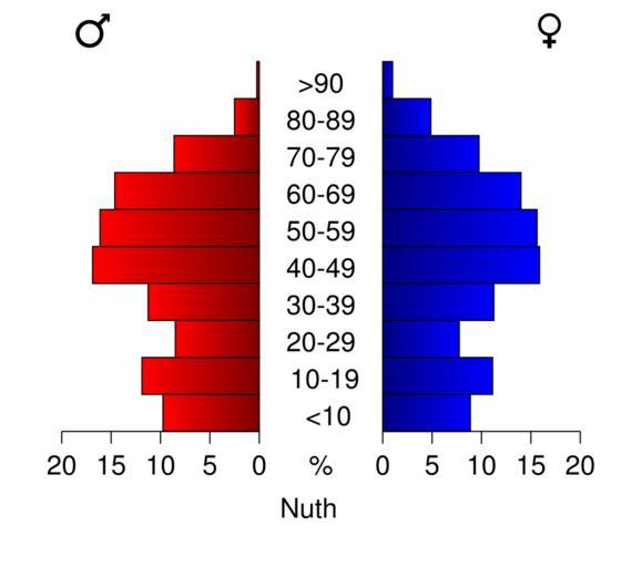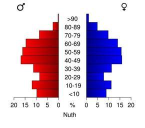 Keywords: Bevolkingspiramide 2008 - CBS gemeentecode 0951.svg Age pyramids for the municipalities in the Netherlands 1/1/2008 Created in svg with own script Statistics provided by Centraal Bureau voor de Statistiek Voorburg/Heerlen Source Tabel Bevolking; burgerlijke staat geslacht leeftijd en regio 1 januari Tabeltoelichting Gewijzigd op 14 mei 2008 Verschijningsfrequentie per jaar http //statline cbs nl/StatWeb/publication/default aspx DM SLNL PA 03759NED D1 1-2 2c15 D2 118-128 D3 1-4 2c8-9 2c13-19 2c21 2c24 2c26 2c28-30 2c33-36 2c38-40 2c43-44 2c48-49 2c52 2c54 2c56 2c59 2c62 2c64 2c67-71 2c78 2c80-84 2c86-89 2c91 2c93-98 2c101 2c103-107 2c109 2c111-112 2c115 2c118-119 2c121-124 2c126-127 2c130 2c132-134 2c136 2c138-141 2c143-144 2c146 2c151 2c154 2c156-157 2c159-160 2c162-163 2c166-167 2c169 2c171 2c177-179 2c181-182 2c184 2c187-189 2c191-195 2c198 2c201 2c204-205 2c207 2c209 2c211 2c214 2c218-219 2c221-224 2c226 2c228-230 2c233 2c236 2c241-243 2c246-251 2c253 2c257-262 2c265 2c271-274 2c276 2c278 2c282 2c284 2c286-290 2c292 2c294 2c296 2c298-299 2c301-303 2c306 2c312-314 2c317-318 2c321-322 2c327 2c329 2c332 2c334-335 2c337 2c339 2c344-346 2c349-353 2c355-358 2c361 2c363-366 2c368 2c370-373 2c380 2c382-383 2c386-391 2c393-395 2c399 2c403-406 2c408-409 2c412 2c416-417 2c419 2c421-422 2c424 2c426-430 2c432-433 2c439-441 2c447-448 2c450-452 2c455-456 2c458-459 2c462-463 2c465 2c468-469 2c471 2c476 2c478-479 2c481-482 2c484-486 2c489 2c491-492 2c496 2c498-500 2c503 2c505-507 2c512-516 2c519-521 2c523-524 2c528-532 2c534 2c536 2c540 2c542-543 2c546-550 2c552-555 2c560-561 2c564-565 2c567-568 2c572-573 2c577-580 2c586 2c588-594 2c597 2c599-603 2c605 2c609-610 2c612-614 2c617 2c619 2c621-624 2c628 2c630-631 2c633 2c636-637 2c640 2c646-647 2c649-651 2c653 2c655-661 2c663-664 2c666 2c668-670 2c673 2c675-681 2c683-684 2c686 2c689-690 2c693 2c695-696 2c698 2c701-702 2c706-710 2c717 2c719 2c721-722 2c724-725 2c727 2c732-733 2c735-742 2c746 2c750-752 2c756-757 2c759 2c761 2c763-764 2c766-769 2c771-772 2c774-775 2c777 2c779 2c783 2c785-788 2c791-793 2c796-797 D4 l HDR T STB G1 2cG2 2cG3 VW D StatLine own work using CBS data 2009-01 Michiel1972 Own work all rights released Public domain Population pyramids of municipalities of the Netherlands 2008