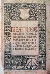 | Keywords: Biblia Ruska.jpg Bible cover cyrillic «Библия уска выложена докто ом Ф анциском Ско иною из славного г ада Полоцка Богу ко чти и людем посполитым к доб ому научению» Bible printed by Francysk Skaryna in 1517 Библия напечатанная Ф анциском Ско иной в 1517 Біблія над укаваная Ф анцыскам Ска ынам у 1517 Біблія над укована Ф анциском Ско ином у 1517 circa 1517 1519 in Prague Francysk Skaryna PD-old Holy Bible by Francysk Skaryna Title pages from the Czech Republic | ||||