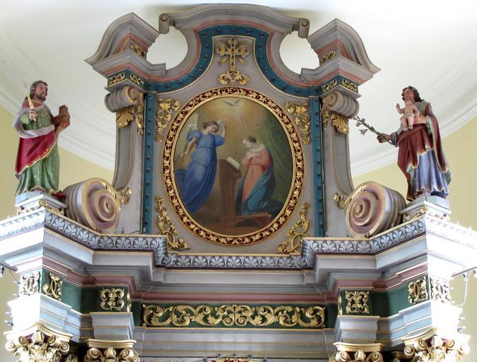 Keywords: Biblisheim StJeanBaptiste 07.JPG Alsace Bas-Rhin Biblisheim Église Saint-Jean-Baptiste Couronnement du maître-autel 1724 Tableau d'autel XIXe Annonciation own 2012 Ralph Hammann cc-by-sa-3 0 Artwork / Œuvre d'art / Kunstwerk oil canvas cm Eglise Saint Jean-Baptiste Biblisheim Couronnement du maître-autel IM67011863 IM67011864 object history Les tableaux du retable ont été remplacés au 19e siècle le maître-autel datant du 1er quart du 18e siècle Le tableau du couronnement est signé Sorg sur le pied du prie-dieu de la Vierge le prénom étant illisible Il pourrait dater du milieu du 19e siècle Le tableau du retable est également signé angle inférieur gauche mais la signature n'a pas pu être déchiffrée Il pourrait s'agir d'une oeuvre de Carola Sorg dans la 2e moitié du 19e siècle other versions Ralph Hammann PD-old accession number Photographs of Biblisheim by Ralph Hammann Taken with Canon PowerShot SX20 IS Maître-autel de l'église Saint-Jean-Baptiste de Biblisheim Church paintings in Bas-Rhin 19th-century church paintings in Alsace 19th-century paintings of Annunciation Paintings of Annunciation in France Caroline Sorg Statues of Saint Joseph in Alsace Henry II Holy Roman Emperor Baroque statues in Bas-Rhin 18th-century statues in Alsace |