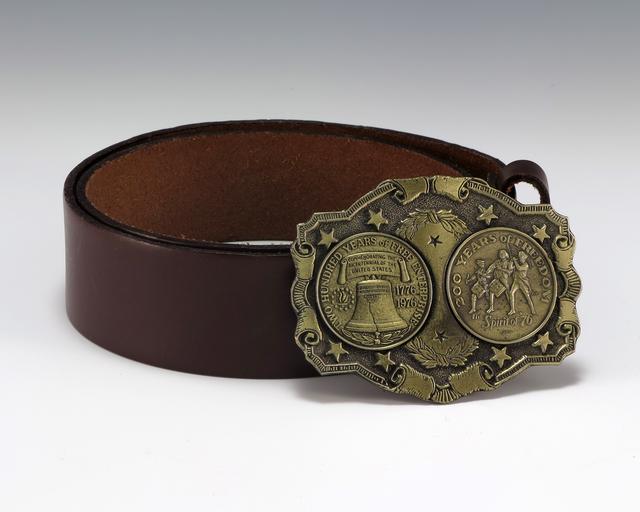 Keywords: Bicentennial Belt.jpg en Black leather belt with a brass commemorative Bicentennial belt buckle with USA / 200 printed in script along with images of the Liberty Bell and the Spirit of ™76 brass 3 H x 40 5 W Institution Gerald R Ford Presidential Museum http //www fordlibrarymuseum gov/museum/ArtifactCollectionSamples/Catagories/Bicentennial/Belt html Belt accession number 1988 916 2 credit line Courtesy of the Gerald R Ford Presidential Museum Donation Date 1976 Institution Institution Gerald R Ford Presidential Museum Gerald R Ford Presidential Library and Museum-cooperation PD-USGov Liberty Bell Belt buckles United States Bicentennial materials in the Gerald R Ford Presidential Museum Uploaded with UploadWizard |