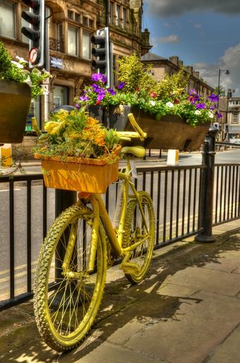 Keywords: bicycle flower box floral display decoration basket outdoors urban city bike garden flowers sidewalk