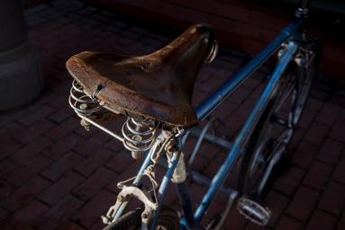 Keywords: bicycle saddle leather worn out blue frame metal city traffic bike old cycle retro ride biking cycling vintage classic street pedal aged speed