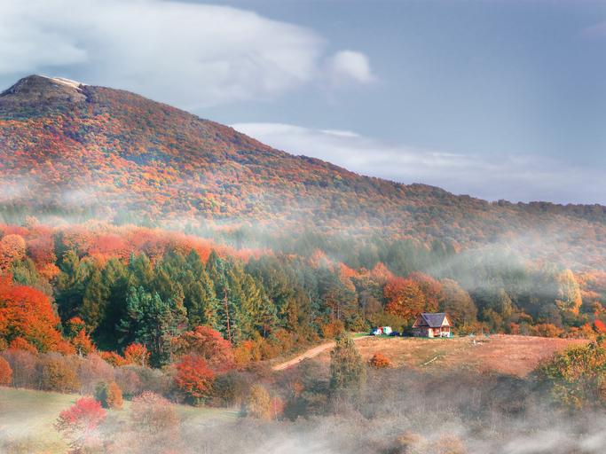 Keywords: bieszczady mountains house cottage autumn foliage tree poland landscape view colors nature holiday top view tourism the silence hiking trails the beauty of nature sky the hills trail