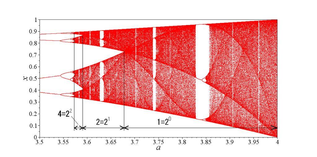 Keywords: Bifurcation diagram logistic map a 3.5 to 4 n-band chaos.png ja ロジスティック写像分岐図 パラメータaが3 5から4まで バンドの数を1 2 4まで示す 2014-12-07 own Yapparina other versions cc-zero Uploaded with UploadWizard Logistic map Bifurcation