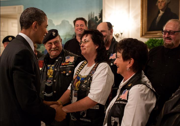 | Keywords: Bikers in the White House.jpg 38 897629 -77 036511 region US-DC_scale 1500 Barack Obama greets members of the Rolling Thunder organization Rolling Thunder organisation in the Diplomatic Reception Room White House Diplomatic Reception Room of the White House on 25 May 2012 The Rolling Thunder are an American military veterans and motorcycling organisation which supports United States war veterans prisoners of war and personnel missing in action in past U S wars Each year during the Memorial Day weekend nearly half a million motor cyclists perform a rolling thunder run to Washington D C to visit the Vietnam Veterans Memorial Wall and other memorials and to hear speeches by members supporters military officials and politicians The Rolling Thunder website explains Their arrival would be announced by the roar of their motorcycles a sound not unlike the 1965 bombing campaign against North Vietnam dubbed Operation Rolling Thunder 2012-05-25 http //www flickr com/photos/whitehouse/7269020826 White House Flickr account Pete Souza PD-USGov Uploaded with UploadWizard Barack Obama in 2012 20120525 Barack Obama shaking hands 20120525 Bikers Rolling Thunder Run to the Wall 20120525 Memorial Day 2012 20120525 Motorcycle leather vests Motorcycle leather jackets Photographs by Pete Souza 20120525 Taken with Canon EOS 5D Mark II 20120525 Uploaded by O'Dea 20120525 Diplomatic Reception Room |