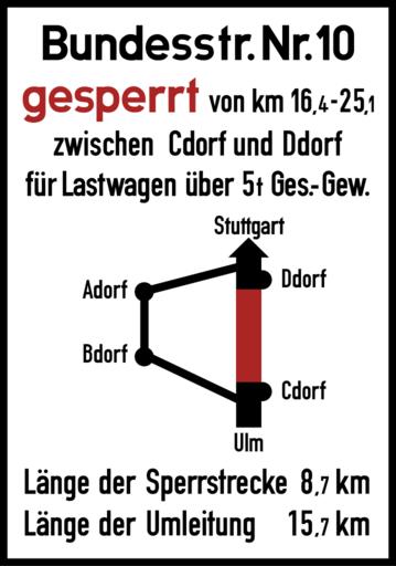 Keywords: Bild 57 - Tafel für Umleitung des Verkehrs auf Bundesfernstraßen, StVO 1953.svg de Bild 57 Tafel für Umleitung des Verkehrs auf Bundesfernstraßen Verkehrszeichen nach den Vorgaben der StVO in der Fassung vom 24 August 1953 Quelle Bundesgesetzblatt Jahrgang 1953 Nr 56 S 1237 Tag der Ausgabe Bonn 3 September 1953 Bundesgesetzblatt Jahrgang 1953 Nr 56 S 1237 Interpretation sowie gezeichnet durch Mediatus Mediatus 2013-08-29 other fields + Signs User Mediatus/no-new-version Cc-zero PD-Vz historisch Diagrams of information road signs of Germany 1953 set 57 Ulm SVG road signs in Germany German language signs |
