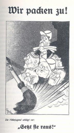 Keywords: Bild-Wir packen zu.jpg Nazi-Propaganda aus Die HJ Juni 1935 als Reaktion auf die Ereignisse des Heidelberger Spargelessens Ein Besen mit Nazi-Emblem fegt die Corpsstudenten die im typischen Karikaturstil der damaligen Zeit als ewiggestrig und ignorant dargestellt werden hinweg Eine deutliche Anspielung auf das Heidelberger Spargelessen sind die quer im Mund des einen Corpsstudenten befindlichen Spargelstangen Bei dem Ereignis sollen die Mitglieder des Corps Saxo-Borussia Heidelberg in aller Öffentlichkeit behauptet haben der Führer habe ein so großes Maul dass er den Spargel quer essen könne Dieses Ereignis führte zur sofortigen Schließung des Corps die beteiligten Studenten wurden der Universität verwiesen der Senior v Quast wurde verhaftet Die Propaganda nutzte den Vorfall um den Prozess der Auflösung und des Verbots der studentischen Verbindungen in Deutschland voranzutreiben nazi propaganda taken from Die HJ June 1935 as a reaction to the events at the Heidelberg asparagus dinner a broom with the Nazi-symbol sweeps away the conservative fraternity called corps in German students all made in the typical cartoon style of this time the students are pictured as backwards orientated and ignorant A sign is the asparagus in the mouth of the students The corps students of the fraternity Saxo-Borussia Heidelberg said at the event the Führer has such a big mouth he could eat asparagus crossways Because of that the corps was closed all students had to leave the university and the Senior v Quast was arrested The nazis used this to close all fraternities and to prohibit all student fraternities in Germany Juni 1935 June 1935 PD-old Nazi symbol 1935 Corps Saxo-Borussia Heidelberg Caricatures of students Political cartoons of Germany Nazi propaganda Brooms in art Sweeping in art Hitlerjugend Dueling scars Senioren-Convent zu Heidelberg |
