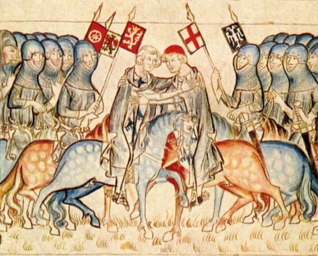 | Keywords: Bilderzyklus des Codex Balduini.jpg Kurfürst Balduin von Trier Wappen rotes Kreuz auf weißem Grund begegnet seinem Neffen Johann dem König von Böhmen Wappen weißer Löwe auf rotem Grund In der Begleitung Johanns erkennt man an seinem Wappen weißes Rad auf rotem Grund den Erzbischof von Mainz Aus dem Bilderzyklus des Codex Balduini Trevirensis Landeshauptarchiv Koblenz http //www politische-bildung-rlp de/fileadmin/download/d52001 pdf PDF PD-old PD-Art Balduin von Luxemburg John I Count of Luxemburg Prince-electors Wheel of Mainz in heraldry User Kandschwar Codex Balduini Trevirensis Medieval miniatures of horses |