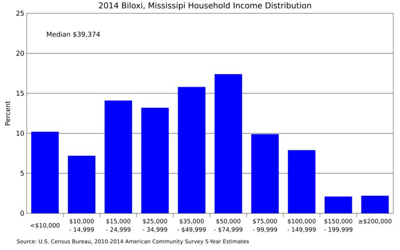 Keywords: Biloxi Mississippi household income distribution.svg translate yes en Distribution of household income in Biloxi Mississippi Data from http //factfinder census gov/bkmk/table/1 0/en/ACS/14_5YR/DP03/1600000US2806220 US Census in 2014 inflation adjusted dollars 2016-06-02 own Delphi234 other versions cc-zero Income distribution in the United States Biloxi Mississippi |