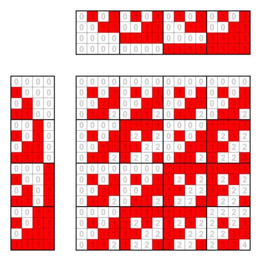 Keywords: Binary Walsh matrix 16.svg Binary Walsh matrix as a product White 0 and red 1 result with modulo 2 operations Gray numbers result with normal operations own mate2code The same in sequency order 100px The same with ternary numbers 100px The same with balanced ternary numbers 100px Walsh matrix of order 16 Binary square matrix; 16x16 Matrix multiplication |