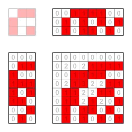 | Keywords: Binary Walsh matrix 8; sequency.svg Binary Walsh matrix in sequency order as a product White 0 and red 1 result with modulo 2 operations Gray numbers result with normal operations The two matrices used as factors which are transposed to each other correspond to the same Walsh permutation wp 6 1 5 0 6 1 7 5 3 4 2 <br> All 6 Walsh permutations whose compression vectors are permutations of 1 5 6 could have been used instead <br> wp 6 1 5 was chosen because it is the only one with a symmetric compression matrix shown in the top left corner <br> It is the square root of wp 4 6 3 which permutes the natural ordered into the sequency ordered Hadamard matrix own mate2code Size 16 100px Walsh matrix of order 8 Walsh matrix; sequency ordered Compression matrices of 3-bit Walsh permutations Matrix multiplication |