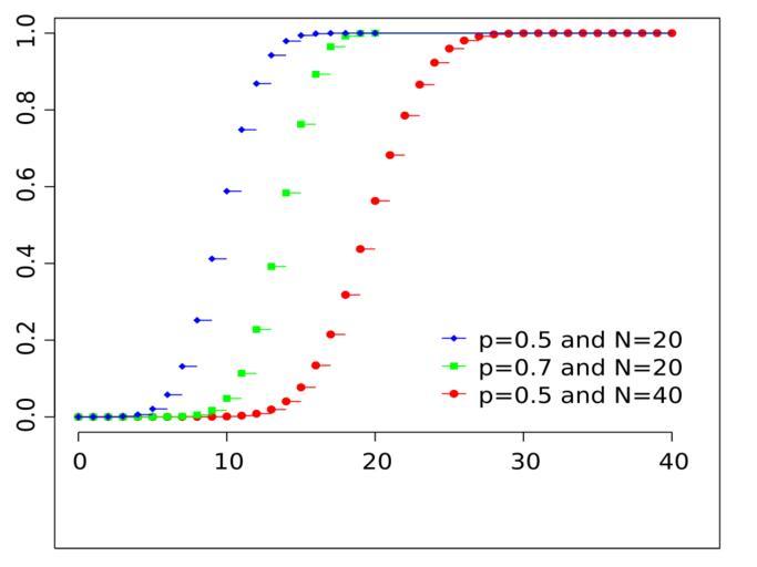 | Keywords: Binomial distribution cdf.svg Binomial distribution cumulative distribution function Own 2008-03-02 Tayste R source code <source lang rsplus > R source code for Wikipedia SVG plot of Binomial CDF by de User Sigbert Feb 2010 require RSvgDevice create binomial cdf <- function N p colour black pch 16 n <- max length N length p length colour length pch N <- rep N length n ; p <- rep p length n colour <- rep colour length n ; pch <- rep pch length n add one series <- function N p colour pch maxN cdf <- pbinom 0 N N p lines 0 N cdf type s col colour for i in 1 N lines c i-1 i c cdfi cdfi type s col colour lines c N maxN c 1 1 type s col colour points 0 N cdf col colour pch pch par lwd 1 5 cex 1 mar c 3 1 2 5 0 5 0 5 plot 1 xlim c 0 max N ylim c 0 1 type n xlab ylab for i in 1 n add one series Ni pi colouri pchi max N text paste p rev p and N rev N sep legend max N 0 legend text xjust 1 yjust 0 pch rev pch lwd rep par lwd 3 col rev colour y intersp 1 5 bty n devSVG Binomial_distribution_cdf svg width 4 height 3 create binomial cdf c 40 20 20 c 0 5 0 7 0 5 c red green blue c 20 15 18 dev off </source> Binomial distributions Images with R source code |