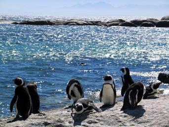 Keywords: bird black and white blue copy space marine bird ocean penguins rocks sea waddle walk walking water