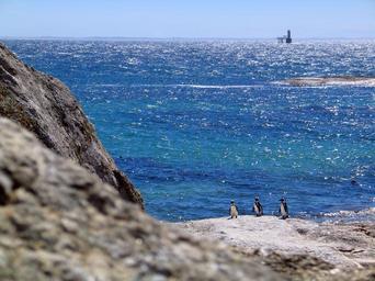 Keywords: bird black and white copy space marine bird ocean penguins rocks sea waddle walk walking water