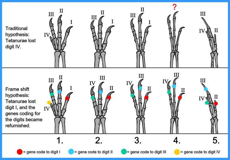 Keywords: Bird and dino hand difference debate.JPG en Diagram made to illustrate the debate over the hands of theropod dinosaurs and their alleged descendants the birds Aves In the last years the difference between the hands of theropods and birds have been an important thing when it comes question the theory that birds evolved from dinosaurs even though some scientists may could refute it In the diagram a Neotheropoda 1 basal tetanurae 2 a coelurosaurian 3 the bird Archaeopteryx 4 and modern bird 5 In 1997 birdexpert Alan Feduccia at University of North Carolina discovered that birds develop hands with the digits II III and IV see The Cincinnati Enquirer 25 - 10 - 1997 This is in contrast with the hands of tetanurae which seems to have the digits I II and III This make it almost impossible for dinosaurs and birds to be closely related according to Feduccia Since the discovery by Feduccia scientific research have came up with a possible explanation to the mystery of the dinosaur - bird hand difference called The frame shift hypothesis see http //scienceblogs com/tetrapodzoology/2009/06/limusaurus_is_awesome php This hypothesis is based on a discovery which shows that although bird embryos develop the fingers II III and IV the genes which is coding for the external appearance of the digits seems to be from the fingers I II and III Based on this scientists belive this when neotheropods evolved into tetanurae the losed digit I not digit IV as earlier suggested During this process the genes which coded for how the digits should looks like the number of phalanges for example became refurnished see the color spots in th upper section in the diagram to understan The discovery of Limusaurus has been said to support this theory see http //www livescience com/animals/090617-dinosaur-hands html One thing is that may can be used to refute that Limusaurus should support the Frame shift hypothesis is that Limusaurus was a ceratosaurian and is dated to be much younger than the oldest tetanurae's Also some tetanure“s may had 4 digits' like the Archaeornithomimus see number 4 in the diagram see also http //dml cmnh org/1998Oct/msg00443 html and the Allosaurus hand in the image here http //upload wikimedia org/wikipedia/commons/6/69/Allosaurus-mounted jpg If this is the digits I II III and IV If so it shows that tetanurae had the digits I II and III and not II II and IV like birds For more in this debate see text section to my picture Raptor-Archaeopteryx-bird hands differens JPG at http //commons wikimedia org/wiki/File Raptor-Archaeopteryx-bird_hands_differens JPG own Conty Archosauria Bird wing bones Reptilia limb bones Animal limb bone comparisons |