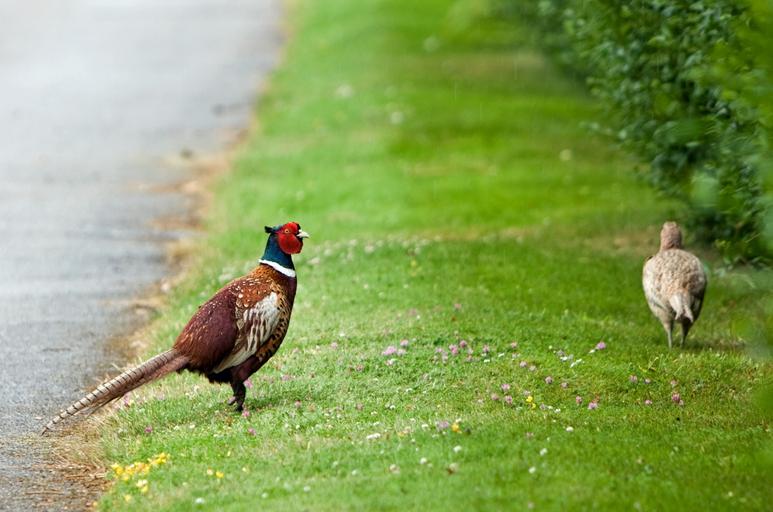 Keywords: bird pheasant beautiful animal nature close-up male birds female hen green grass outdoors