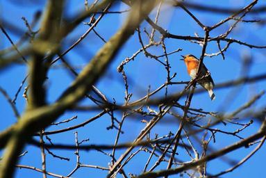 Keywords: bird songbird robin animal species animals nature birds wildlife photography cute small tree branches branches sky blue spring clear sunny twitter sing