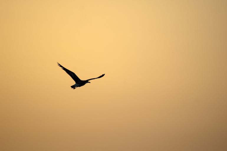 Keywords: bird sunset sky light orange eventide seagull fly flight west against light end of afternoon twilight silhouette beach