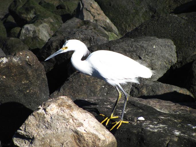Keywords: bird white animal nature feather wing rocks long beak long legs yellow eye wildlife marine yellow heron white heron ocean