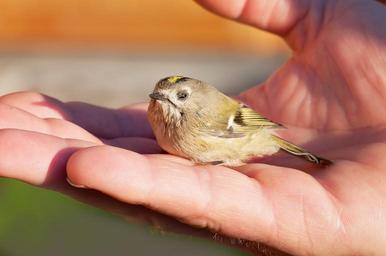 Keywords: bird young bird goldcrest animal weakened hand in the hand close