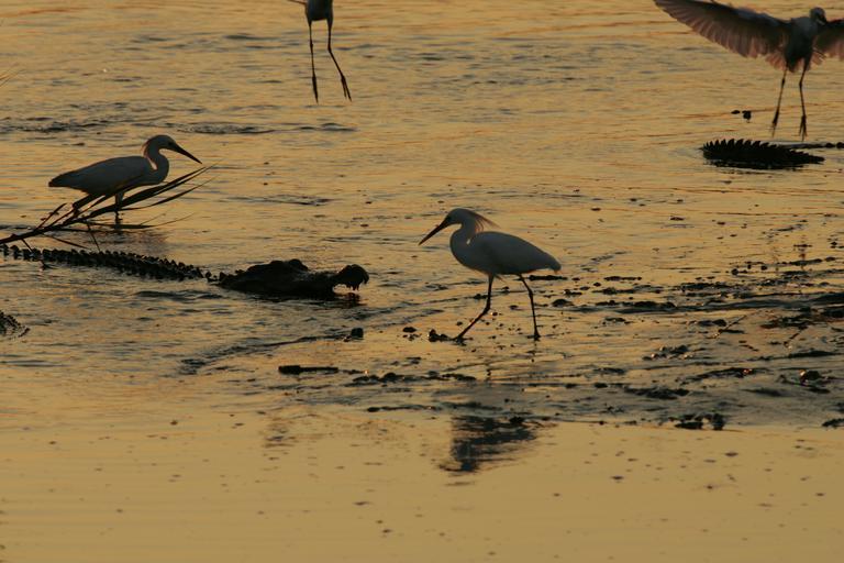 Keywords: birds egrets alligator wildlife reptile water danger wading sunset nature silhouettes