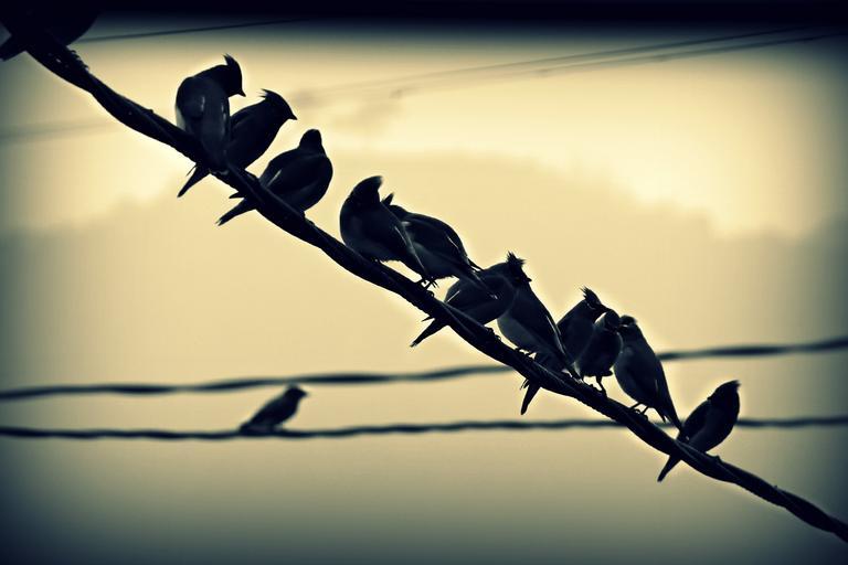 Keywords: birds perched wire row flock nature animal feather outdoors group cable cute retro