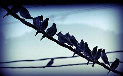 Keywords: birds perched wire row flock nature animal feather outdoors group cable cute blue cold retro
