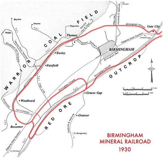 | Keywords: birmingham railroad iron steel map The Birmingham Mineral Railroad (BMAL or BMRR), sometimes called the Birmingham Mineral Branch, or the L & N Mineral Railroad was a common-carrier railroad line opened in 1884 by the Louisville & Nashville Railroad on Red Mountain and across Jones Valley, encircling the city of Birmingham. It was a branch of the North & South Alabama Railroad, one of the two trunk railroads whose crossing established the location for the founding of the city of Birmingham in 1871. (source: www.bhamwiki.com/w/File:Bham_Mineral_RR_1930.png) The Birmingham Mineral Railroad (BMAL or BMRR), sometimes called the Birmingham Mineral Branch, or the L & N Mineral Railroad was a common-carrier railroad line opened in 1884 by the Louisville & Nashville Railroad on Red Mountain and across Jones Valley, encircling the city of Birmingham. It was a branch of the North & South Alabama Railroad, one of the two trunk railroads whose crossing established the location for the founding of the city of Birmingham in 1871. (source: www.bhamwiki.com/w/File:Bham_Mineral_RR_1930.png) |