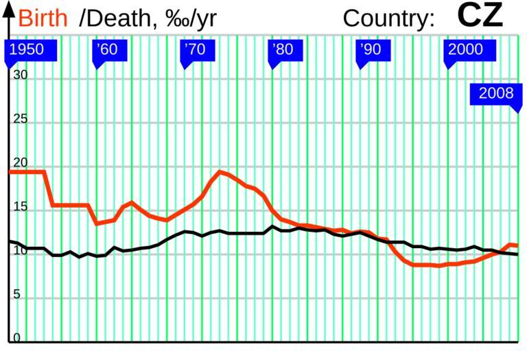 ΠΈΠΈ 1950 2008 own Incnis Mrsi 2009-07-14 public domain File RNI 1950 CZ svg Disclaimer The author of this graph gives no warranty and accepts no responsibility for its factual accuracy This graph is nothing but a visualization of data from http //demoscope ru/weekly/ias/ias05 php tim 0 cou 36 terr 1 ind 26 Submit OK http //demoscope ru/weekly/ias/ias05 php tim 0 cou 36 terr 1 ind 1 Submit OK which may be incomplete or error-prone If you find an error please correct the data in a <path d ¦ /> tag adding some comments about your reliable source and upload the file over Demographics of the Czech Republic Birth and death rates |