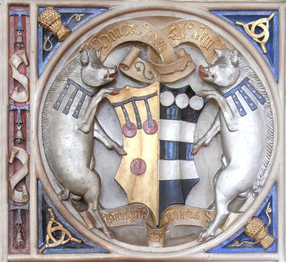 Keywords: BishopPeterCourtenay Mantelpiece ExeterPalace CourtenayImpalingHungerford.jpg Detail from Bishop Peter Courtenay's Mantelpiece c 1480 Bishop's Palace Exeter Arms of Courtenay of Powderham impaling Hungerford arms of the father and mother of Bishop Peter Courtenay d 1492 Supporters two Courtenay boars each charged with a label of 3 points each point charged with 3 roundels On a scroll above Honor deo et regi honour to God and the king ; on a scroll below Arma p at rib us et matris The arms of his fore fathers and mother In the 4 spandrels are the heraldic badges of the Hungerford family a wheatsheaf and 3 conjoined sickles The left border contains 3 tau crosses from each of which hang a bell symbols of St Anthony of Egypt a favourite saint of the bishop See Rev George Oliver Lives of the Bishops of Exeter and a History of the Cathedral Exeter 1861 pp 255-257 In 1883 no traces of colouring survived thus the present colourings are modern See Maria Halliday A Delineation of the Courtenay Mantelpiece in the Episcopal Palace at Exeter by Roscoe Gibbs Torquay 1884 own photo 2013 Lobsterthermidor <span class signature-talk >talk</span> 12 08 8 October 2013 UTC Also uploaded to Flickr by same author under another pseudonym Bishop Courtenay's Mantelpiece Exeter Palace Reliefs of coats of arms in England House of Courtenay Boars in supporters Boars in heraldry Hungerford arms Courtenay boar |
