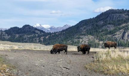 Keywords: bison mammals outdoor grassland landscape field animal hill Bison in Lamar Valley with Cutoff Peak in background; Diane Renkin; October 2016; Catalog #20810d; Original #P1010676 Bison in Lamar Valley with Cutoff Peak in background; Diane Renkin; October 2016; Catalog #20810d; Original #P1010676