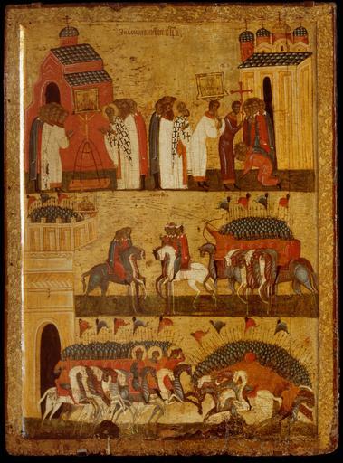 Keywords: Bitva novgorodcev GTG.jpg ru Битва новго одцев с суздальцами Чудо от иконы Знамение овго од се едина XV века Де ево темпе а 133x90 Госуда ственная Т етьяковская гале ея В основе сюжета иконы лежит действительное исто ическое событие В 1169 году войска суздальского князя стислава Анд еевича сына Анд ея Боголюбского осадили овго од но не смогли взять его благода я чуду от новго одской святыни иконы «Богомате ь Знамение» а иконе последовательно аск ывается это событие В ве хнем егист е новго одцы молятся пе ед иконой «Богомате ь Знамение» у це кви Спаса на то говой сто оне затем пе еносят ее в детинец к собо у Святой Софии В с еднем егист е послы ведут пе егово ы и однов еменно начинаются военные действия суздальцы мечут ст елы в икону «Богомате ь Знамение» Икона стоящая на башне заслоняет собой новго одцев и ослепляет в агов В нижнем егист е изоб ажено выступающее из к епостных во от новго одское войско кото ое возглавляют святые воины Гео гий Бо ис и Глеб Сп ава азбитое смятенное войско суздальцев «Знамение от иконы Бого одицы Битва новго одцев с суздальцами » я кий ха акте ный п име новго одской иконописи эпохи асцвета В ней воплощена мощная духовная эне гия; композиция отличается ясностью выве енностью и четкостью пост оения; цветовая гамма с п еобладанием кинова и глубоко самобытна XV century CD-ROM Госуда ственная Т етьяковская гале ея Издание 2-е; Допол Издательство AlexSoft 2004 RusIcon http //www tretyakovgallery ru/ru/collection/_show/image/_id/2607 PD-Art Uploaded with UploadWizard Battle between Novgorod and Suzdal 15th-century icons in the Tretyakov Gallery Icons of Velikij Novgorod |