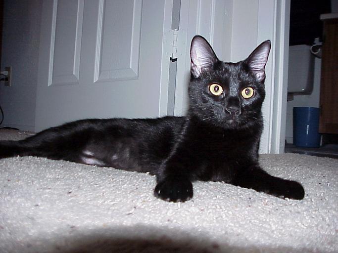 Keywords: Black cat laying.JPG Self taken of black cat named shadow She is sitting down and looking into the distance Picture taken from her height 2006-07-26 own assumed Cep21 Solid black cats
