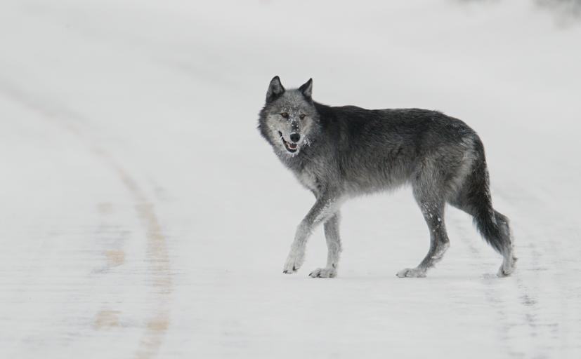 Keywords: outdoor Black and grey wolf (female from Druid pack,"Half Black") walking in road near Lamar River bridge; Jim Peaco; December 31, 2003; Catalog #18017d; Original #B66G2785 Black and grey wolf (female from Druid pack,"Half Black") walking in road near Lamar River bridge; Jim Peaco; December 31, 2003; Catalog #18017d; Original #B66G2785
