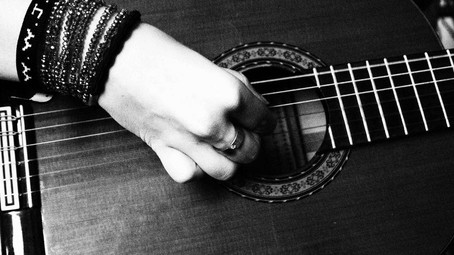 Keywords: black white hand guitar music woman luck joy inspiration human strings wood hands fingers sound