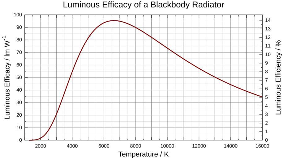 | Keywords: Blackbody efficacy 1000-16000K.svg en Luminous efficacy of a blackbody radiator within 1000 to 16000 Kelvins The plotted data are derived by integration of Planck function convolved via the CIE 1924 photopic V λ luminosity function equivalent to the y function of the CIE 1931 color-matching functions Data points are interpolated as cubic splines by gnuplot The luminous efficacy is given by the left scale and the grid The right scale shows the luminous efficiency in percent with 100 referring to the visual maximum for monochromatic light at 555 nm and 683 lm/W efficacy own SiriusB 2011-13-14 Created with Gnuplot CIE 1931 Black body spectra Cc-zero |
