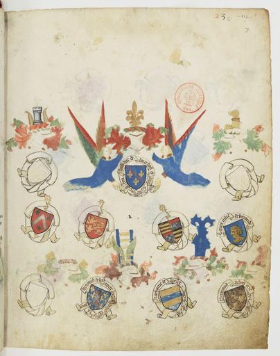 | Keywords: Blason bourbon P23.jpg fr « Registre d'armes » ou armorial d'Auvergne dédié par le hérault Guillaume REVEL au roi Charles VII between 1401 1500 btv1b8470455b/f33 item creator unknown other versions PD-old-100 Roger de Gaignières Armorial d'Auvergne |