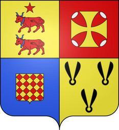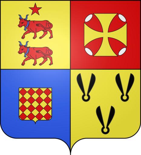 Keywords: Blason de la ville de Bouteville (Charente).svg blazon of en city of Bouteville Bouteville Charente Bouteville Charente fr Écartelé au premier d'or à deux vaches de gueules accornées et clarinées d'azur surmontées d'une étoile de gueules; au deuxième de gueules à une croix pattée et alaisée d'or accompagnée de 4 amandes d'argent posées en cercle; au troisième d'azur à un écusson losangé d'or et de gueules; au quatrième d'or à trois forces de sable posées deux et un spax89 Projet Blasons Own spax89 v -Blasons other versions Bouteville Cows in heraldry Scissors in heraldry Coats of arms of cities in Charente SVG coats of arms of France DEFAULTSORT Bouteville