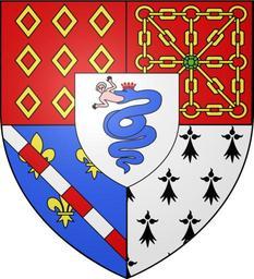 Keywords: Blason de la ville de Sainte-Maure-de-Touraine (37).svg blazon of en city of Sainte-Maure-de-Touraine Sainte-Maure-de-Touraine Indre-et-Loire Sainte-Maure-de-Touraine Indre-et-Loire fr Écartelé au premier de gueules aux neuf mâcles d'or accolées ordonnées 3 3 et 3 au deuxième de gueules aux chaînes d'or posées en orle en croix et en sautoir chargées en cœur d'une émeraude au naturel au troisième d'azur aux trois fleurs de lys d'or brisé d'un bâton componé d'argent et de gueules de six pièces au quatrième d'hermine plain; sur le tout d'argent à la guivre d'azur ondoyant en pal couronnée de gueules à l'issant du même Projet Blasons Own v -Blasons other versions 9 mascles Or in heraldry Derivatives of the Coat of arms of House of Rohan Sainte-Maure-de-Touraine Blason Coats of arms of cities in Indre-et-Loire SVG coats of arms of France DEFAULTSORT Sainte-Maure-de-Touraine